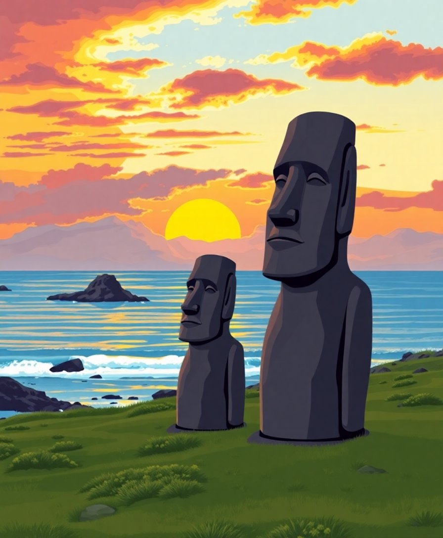Ultimately, step back and admire your completed coastal masterpiece. The vintage sunset hues perfectly complement the majestic moai silhouettes. Your finished artwork captures the timeless beauty of this world scene.