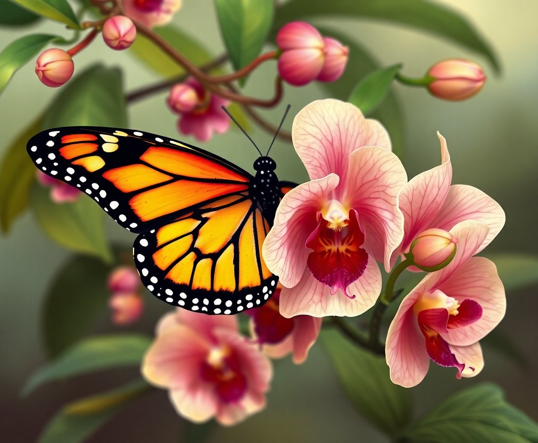 Ultimately, step back and admire your completed vintage botanical masterpiece. The harmonious blend of orange monarchs and delicate orchids creates a captivating focal point. Your finished artwork reflects both artistic skill and personal accomplishment.