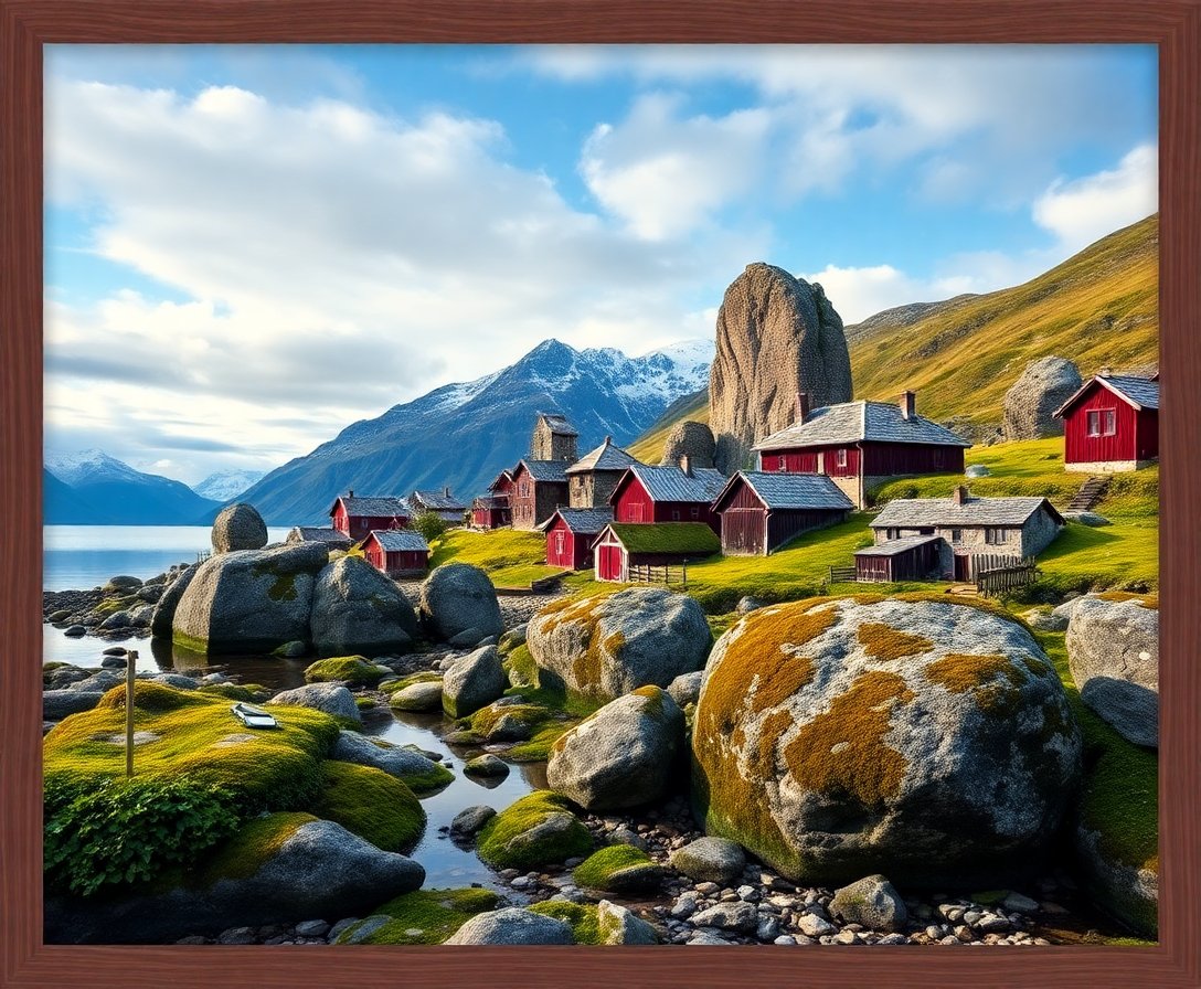 Premium linen canvas ensures durability and professional results. Vibrant acrylic paints maintain color integrity over time. The vintage Nordic theme appeals to lovers of Scandinavian design aesthetics. Additionally, Scandinavian fjord villages complement this mossy boulder landscape perfectly in any gallery wall arrangement.
