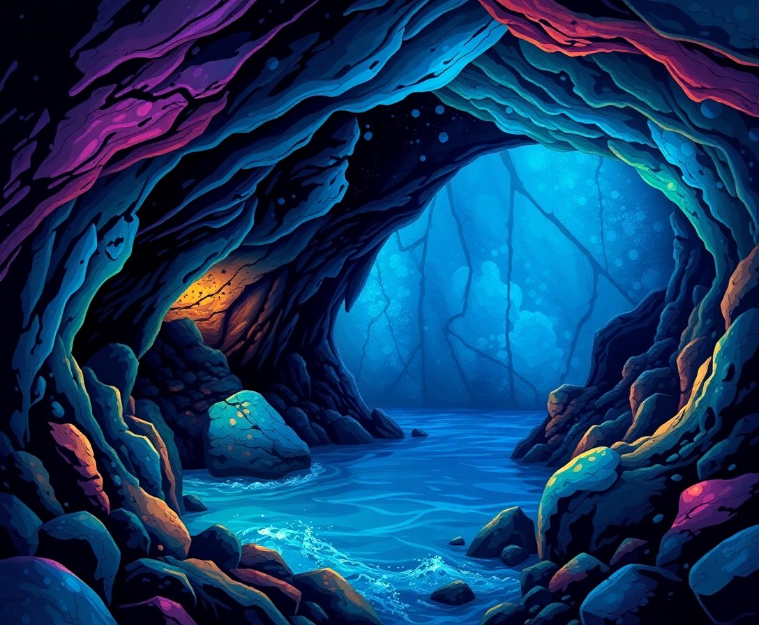 The carefully selected turquoise and luminescent paint colors create natural depth perception. The vintage color palette enhances the mystical cave atmosphere beautifully.