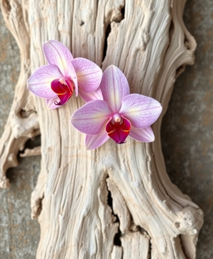 The canvas measures 16×20 inches, perfect for displaying on walls or easels. This size provides enough detail to showcase the intricate orchid and driftwood elements beautifully.