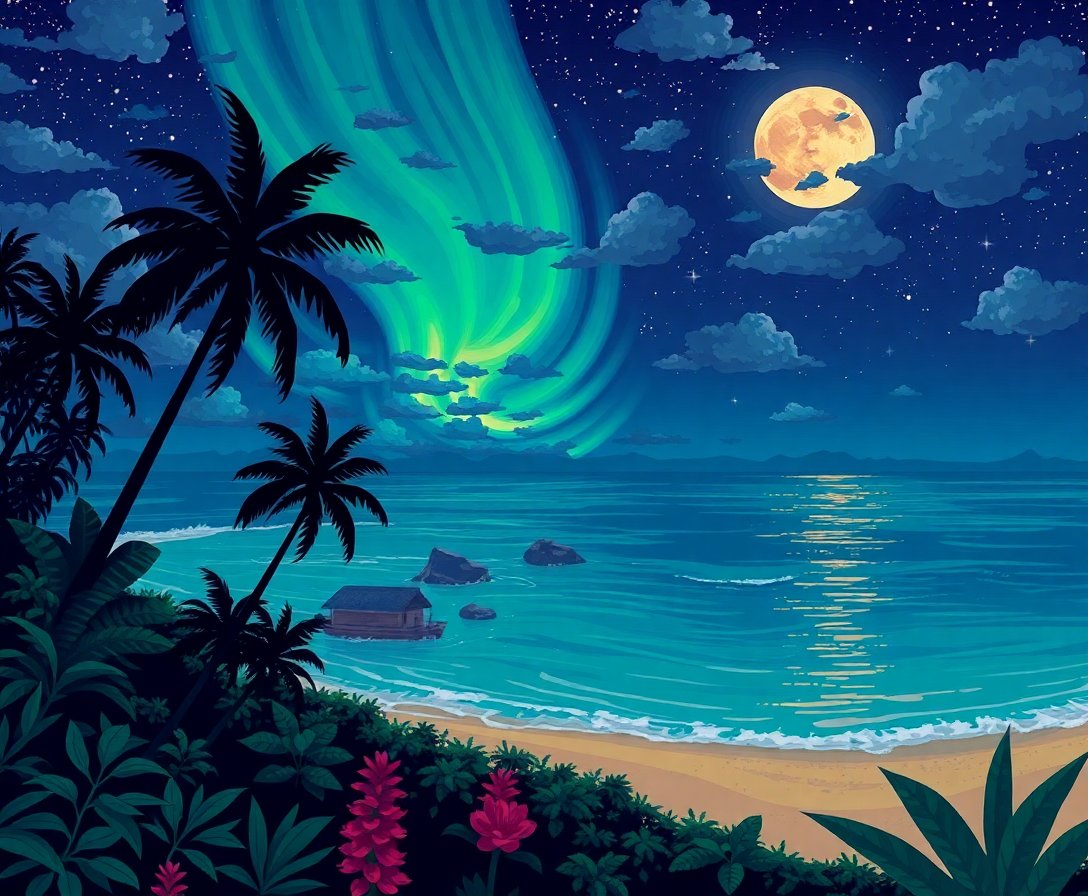 Transform your creative space with this stunning Vintage Otemanu Aurora Paint By Numbers kit. This mesmerizing tropical nightscape captures the ethereal beauty of aurora borealis dancing over silhouetted palm trees. Experience the magic of vintage-inspired artistry through guided painting.