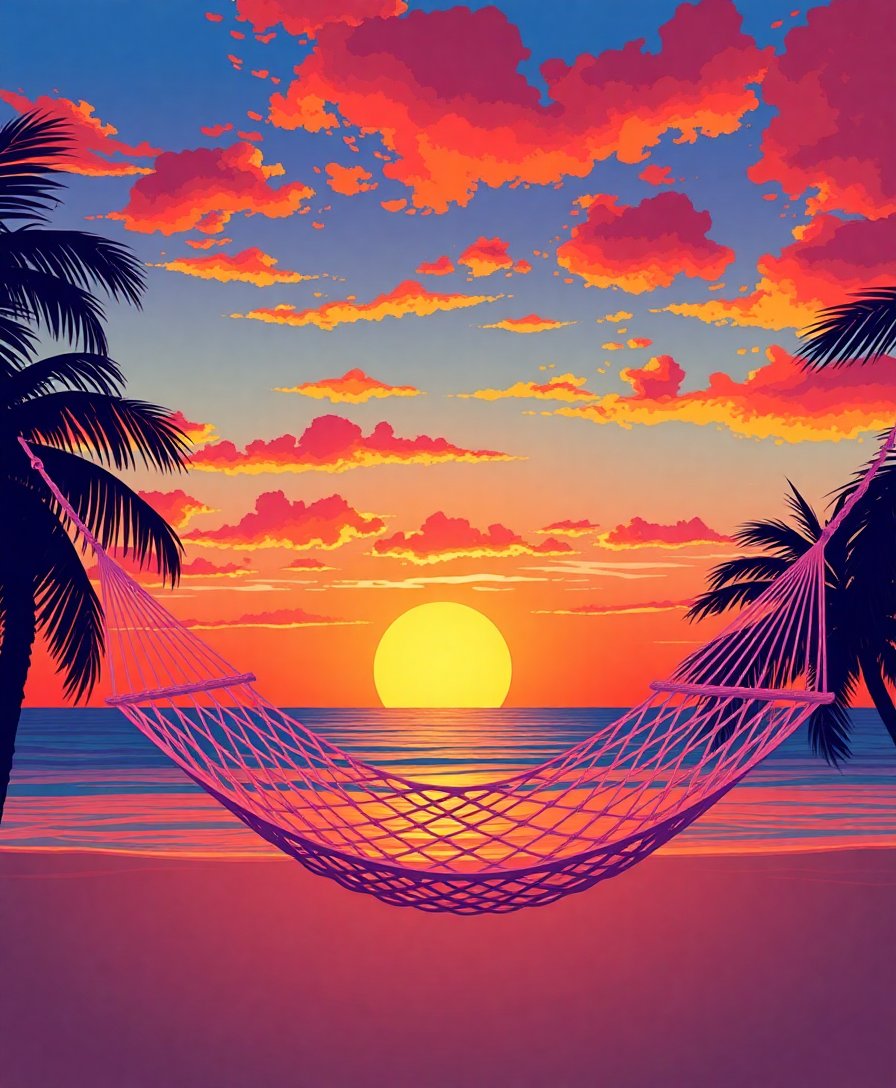 Transform your space with the serene beauty of a tropical sunset through this captivating Vintage Palm Hammock Sunset Paint By Numbers kit. This stunning artwork captures the peaceful essence of a hammock swaying between palm silhouettes as golden warmth bathes the horizon.