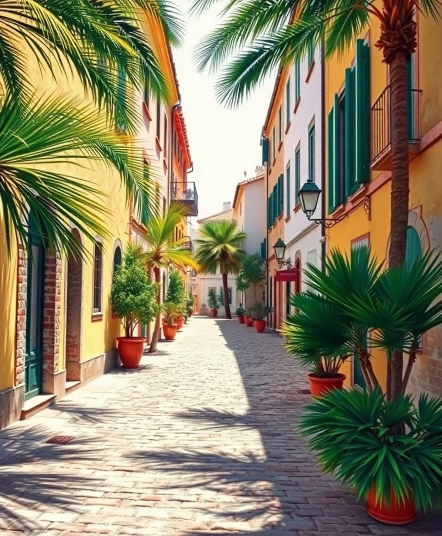 Ultimately, apply final details to palm shadows and cobblestone textures. Furthermore, step back to admire your completed European alleyway scene. Your finished artwork radiates timeless Mediterranean beauty.