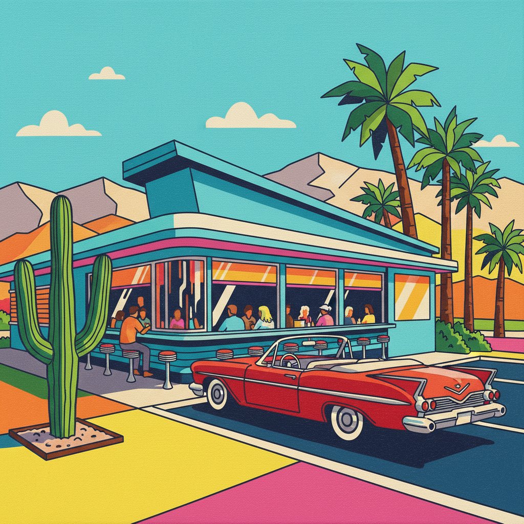 Transform your space with the nostalgic charm of the Vintage Palm Springs Diner Paint By Numbers kit. This captivating artwork captures the iconic essence of mid-century Americana. Furthermore, each brushstroke brings you closer to creating a stunning tribute to classic diner culture.