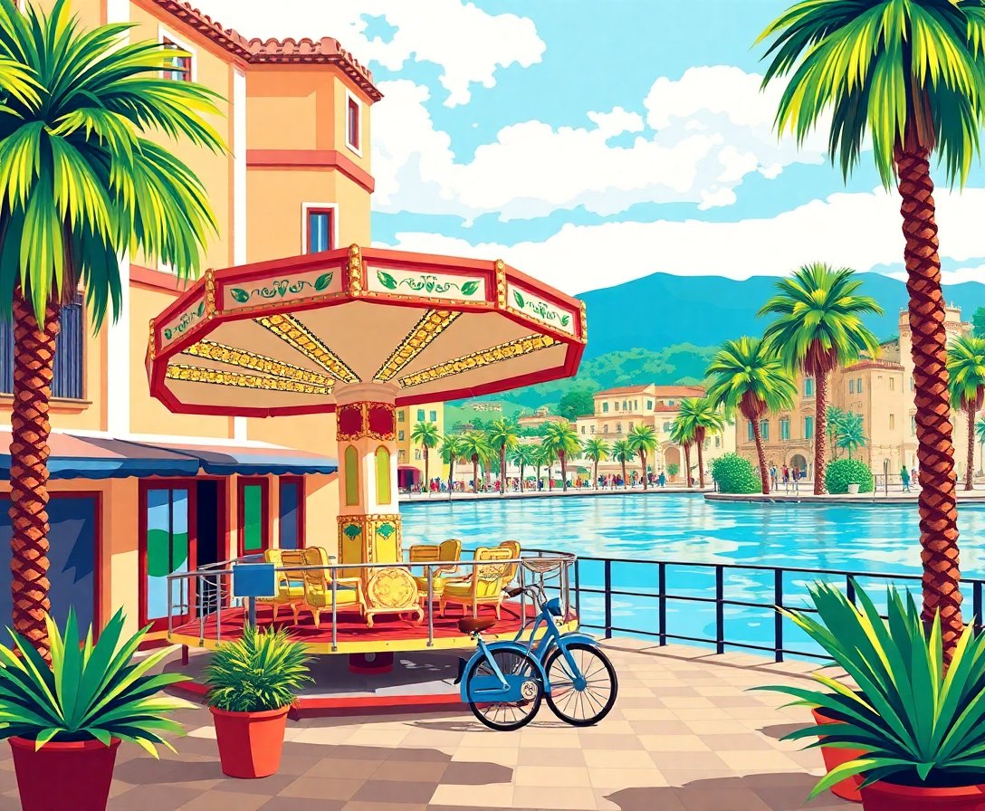 This design captures the romantic essence of Italian street life with its charming bicycle and palm tree composition. The sunlit atmosphere and vintage aesthetic create a truly unique artistic experience.