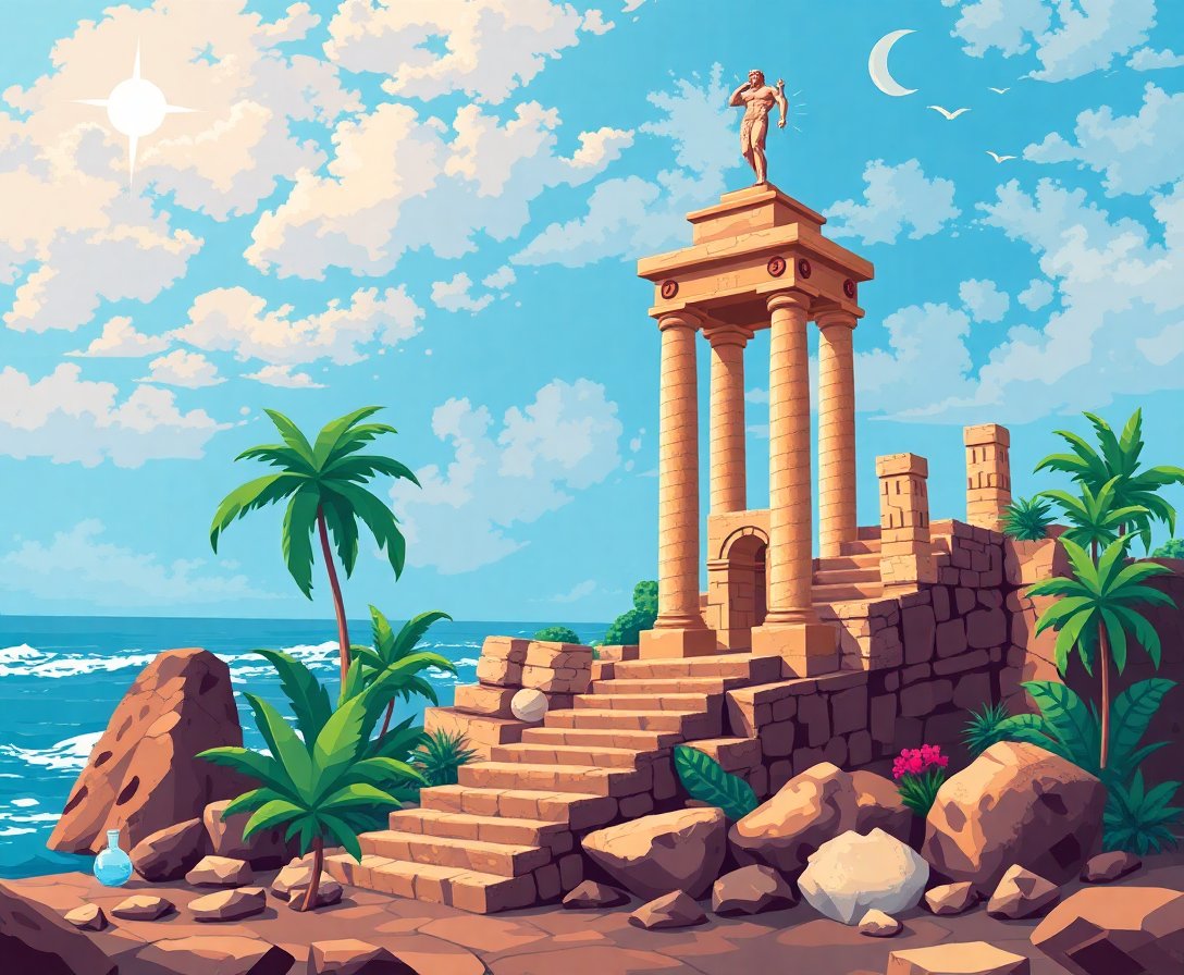 Moreover, this unique design combines tropical paradise with mythological grandeur perfectly. Additionally, the vintage color palette creates an authentic aged appearance. Finally, each brushstroke brings you closer to ancient Hellenic ruins and their fascinating stories.