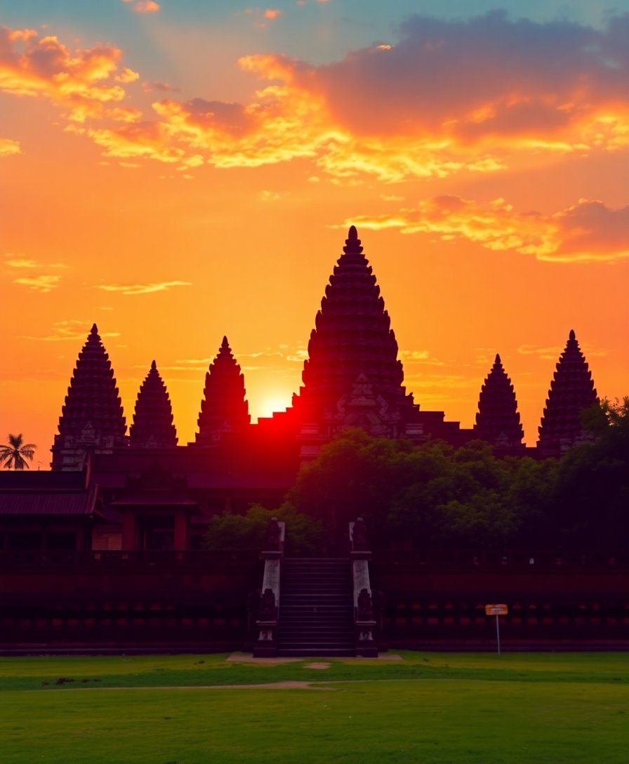 Ultimately, add the finishing touches to capture the vintage atmosphere. Step back and admire your completed Prambanan temple scene. The warm sunset glow and ancient silhouette create a mesmerizing focal point.