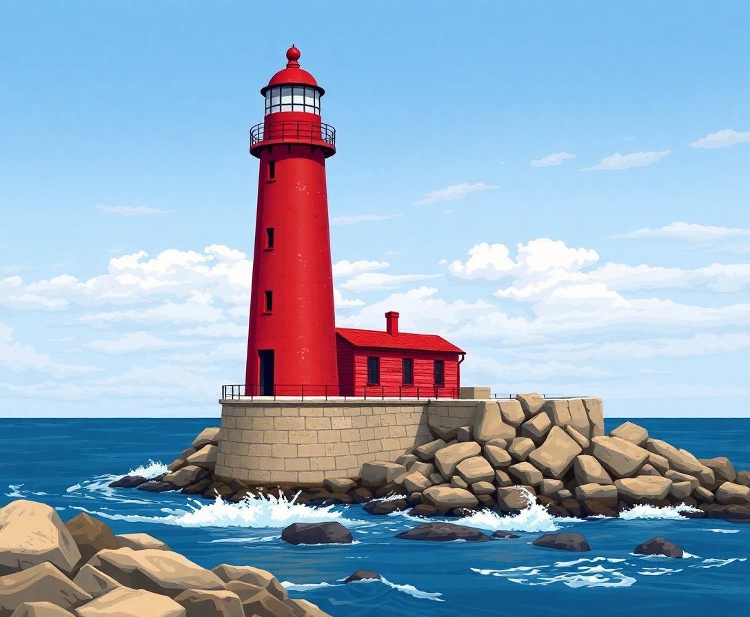 Subsequently, begin with the lighthouse’s distinctive red sections using small, controlled strokes. Moreover, work systematically from top to bottom. Additionally, blend colors gently where numbers meet to create smooth transitions that enhance the weathered coastal appearance.