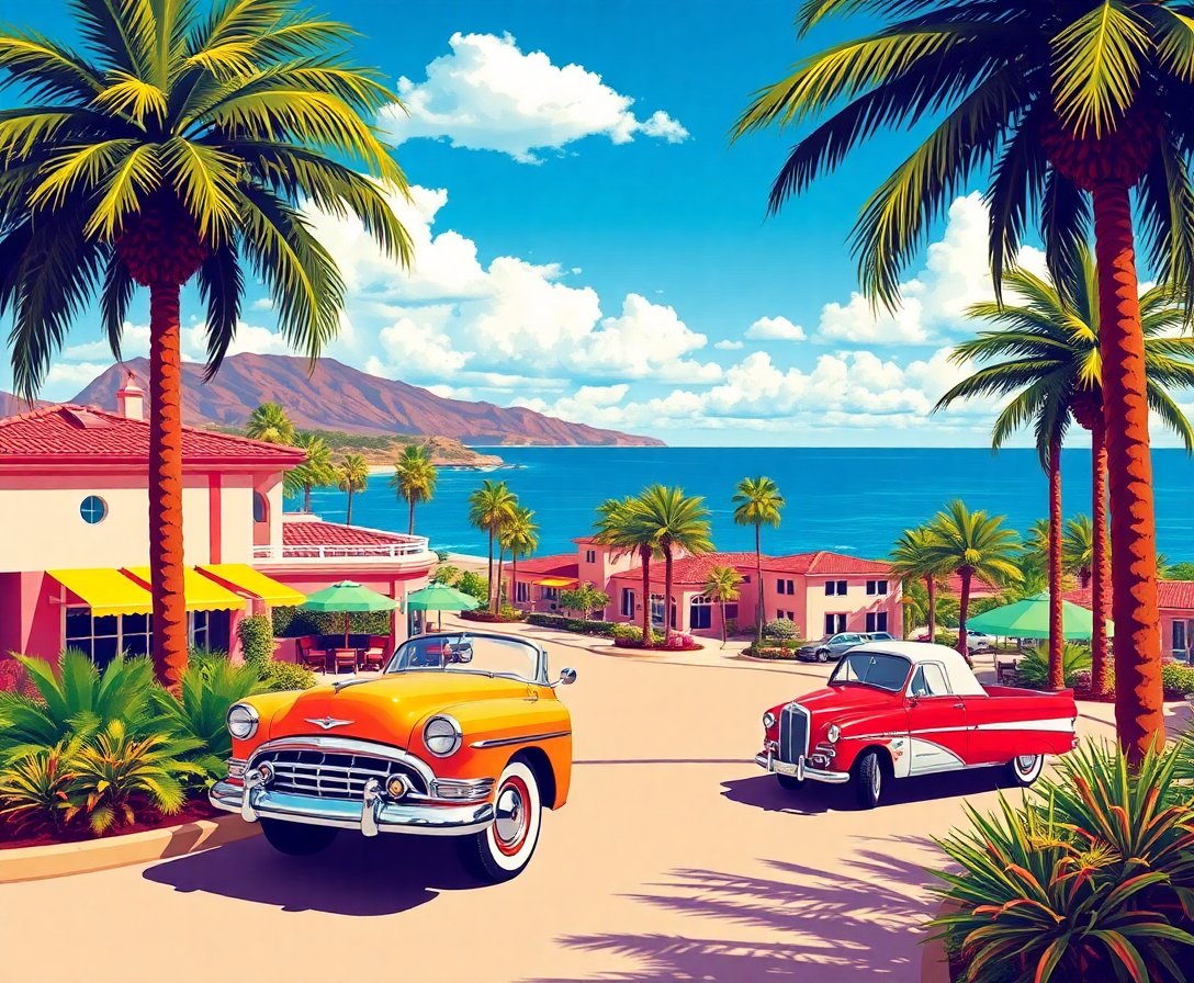 Ultimately, add the final touches to your convertible and palm details. Consequently, your nostalgic European coastal scene comes to life with remarkable depth and character.