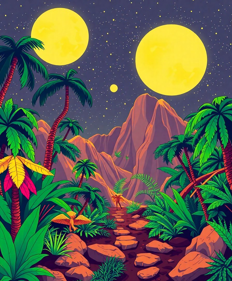 Begin your artistic adventure today with this enchanting vintage scifi jungle planet creation. Transform blank canvas into a window to distant worlds through the magic of cinematic imagination.