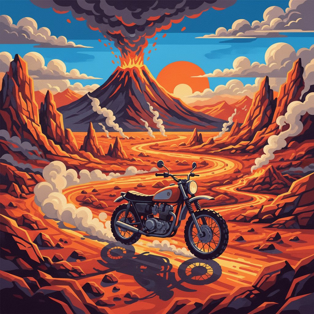 This unique design captures the dramatic beauty of volcanic landscapes combined with classic vintage motorcycle aesthetics. The realistic details create an immersive painting experience.