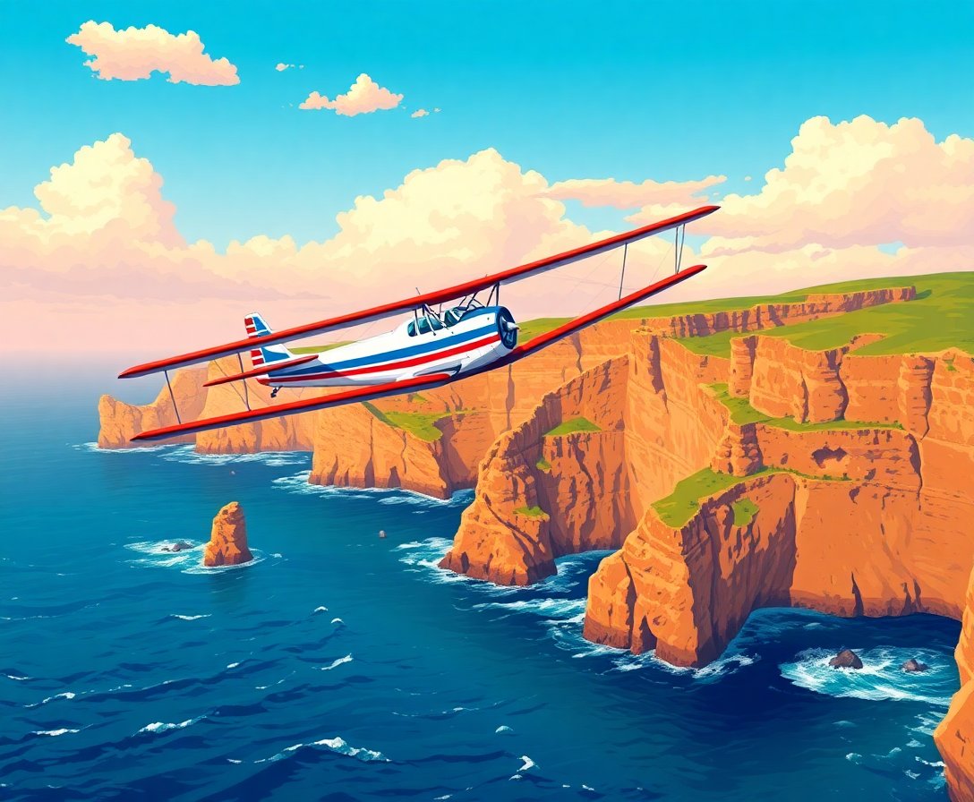 The nostalgic aviation theme combined with dramatic coastal cliffs creates a unique vintage atmosphere. The muted color palette adds authentic period charm to your finished artwork.