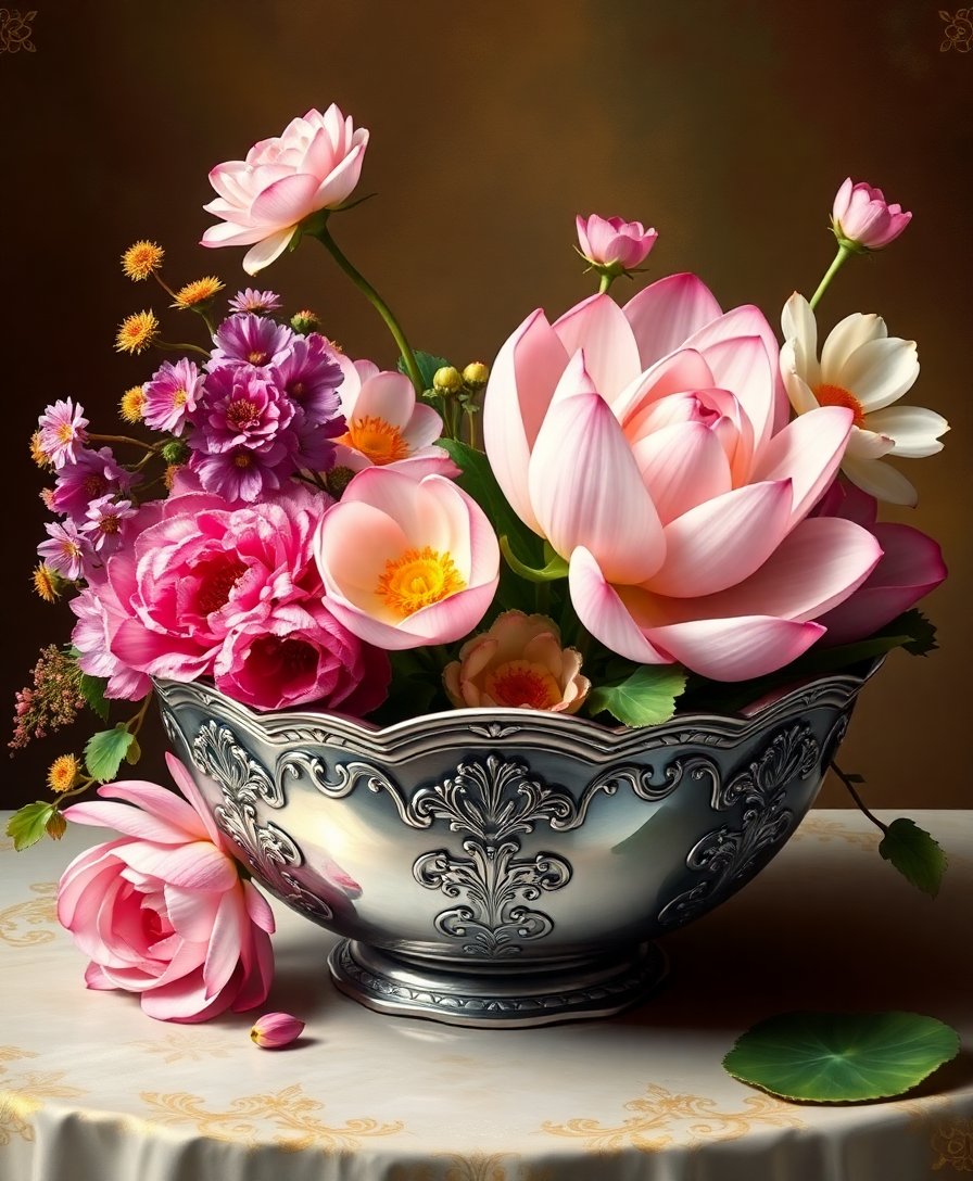 Vintage Silver Lotus Bowl Paint By Numbers