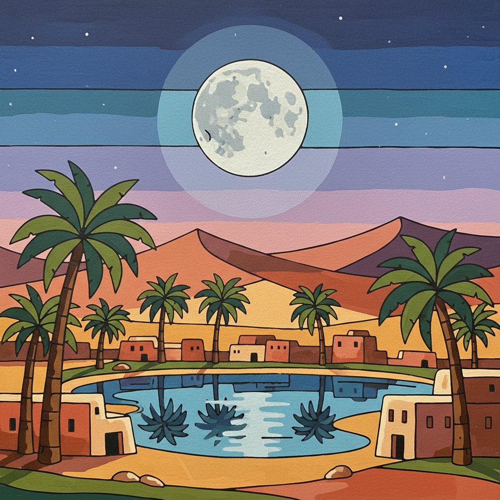 Transform your space with the enchanting Vintage Siwa Moonrise Paint By Numbers, capturing the mystical beauty of an ancient desert oasis beneath a crescent moon. This stunning nightscape combines vintage aesthetics with the serene allure of palm-fringed salt pools.
