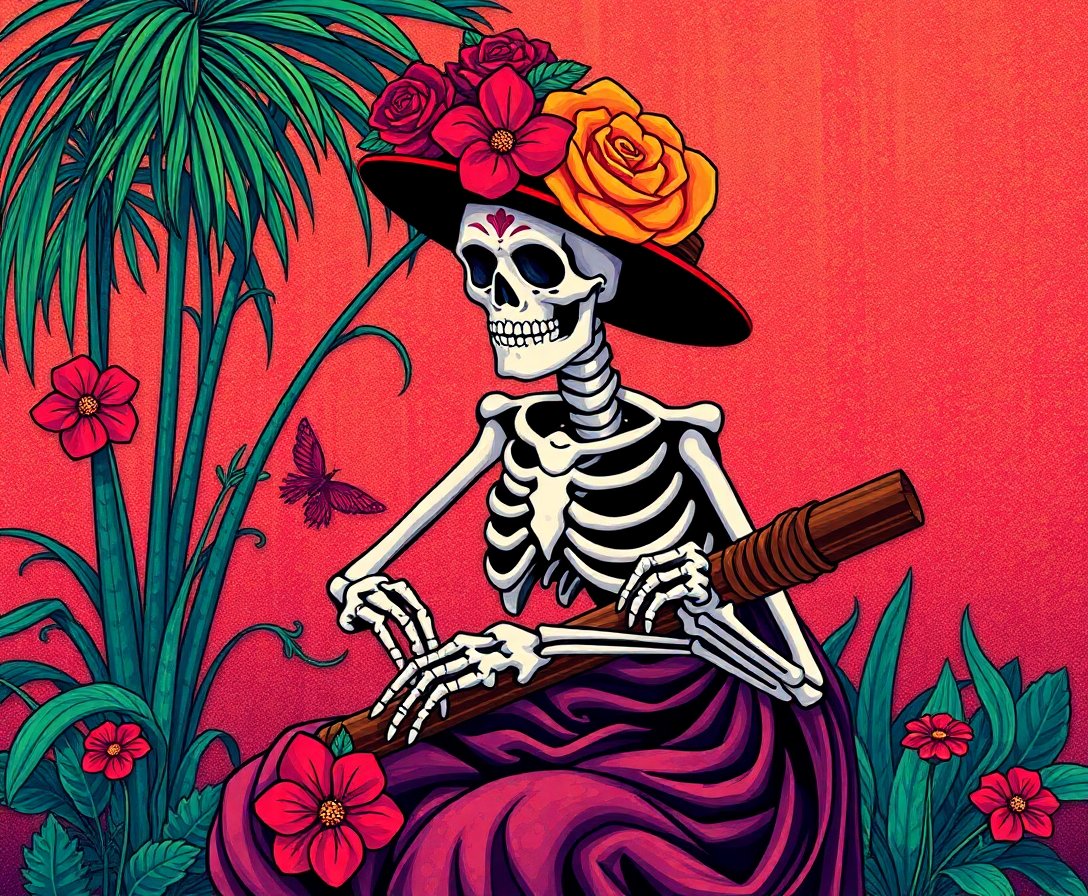 The sepia tones and macabre elegance create a unique aesthetic perfect for Halloween or Day of the Dead celebrations. The intricate palm fronds add artistic depth to this captivating design.