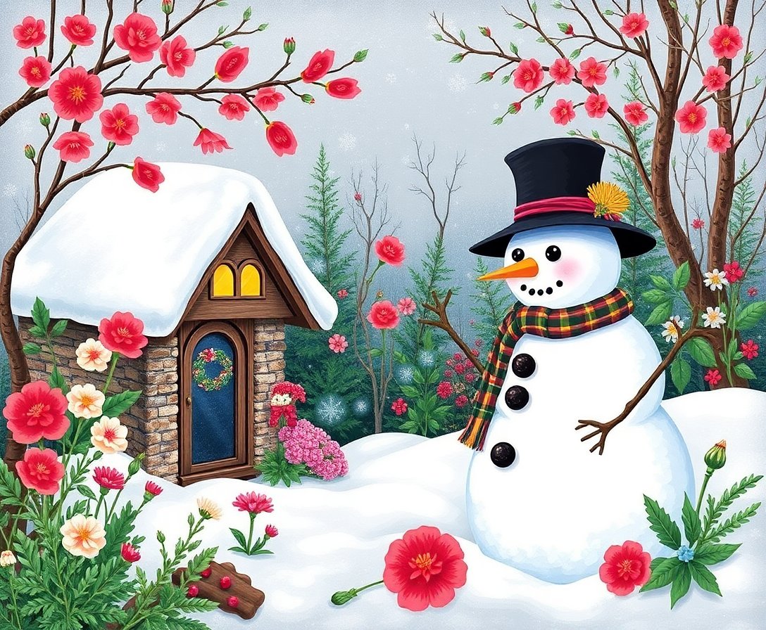 Ultimately, add final details with the small brush for precision work. Watch your vintage snowman come alive among ancient botanical ruins. The finished masterpiece radiates timeless charm and mystical beauty.