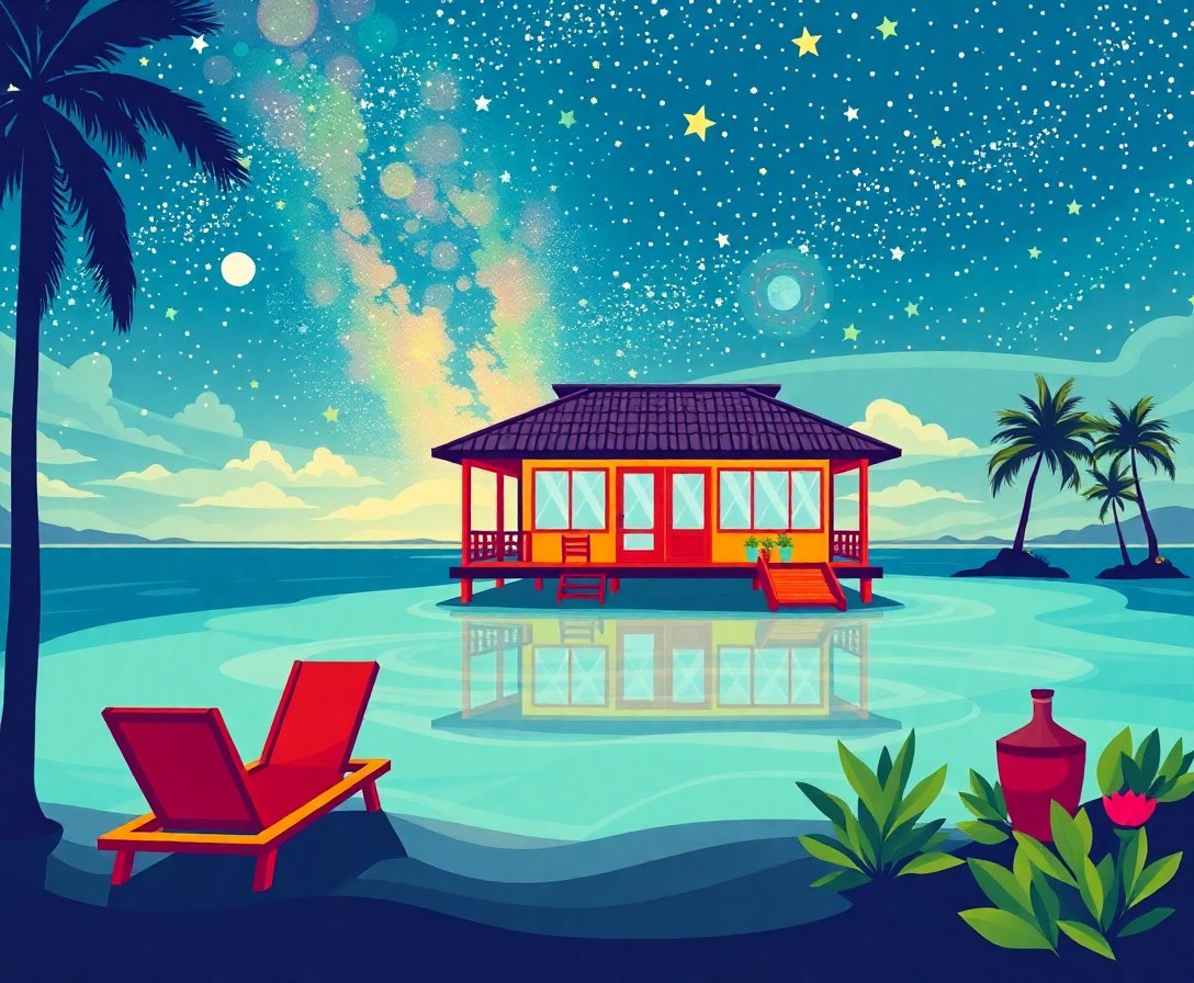 Transform your space with this enchanting Vintage Starry Lagoon Bungalow Paint By Numbers kit. This captivating nightscape features a charming bungalow nestled beside serene lagoon waters under a magnificent starry sky. The vintage aesthetic combines indigo hues with gentle coastal tones, creating a peaceful island retreat scene.
