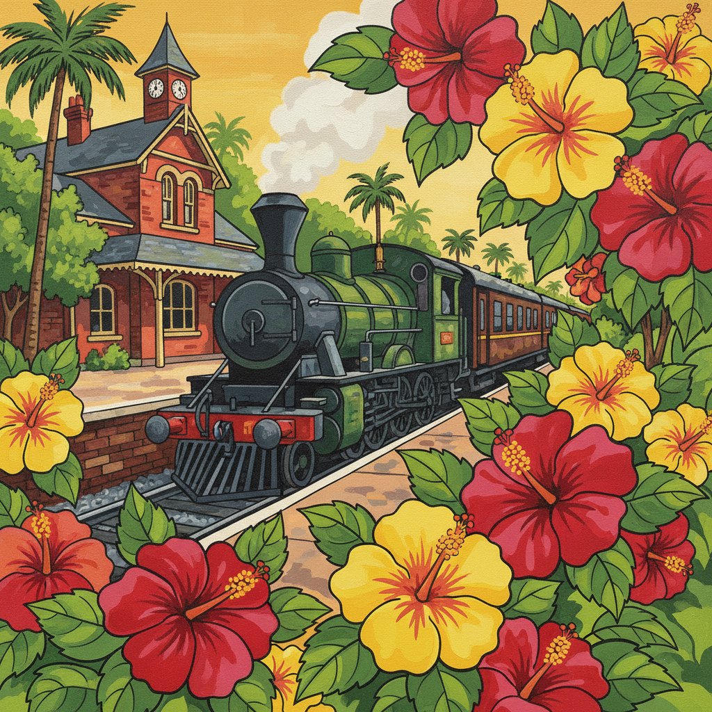 Ultimately, add final touches to the delicate hibiscus petals and architectural details. Step back to admire your completed masterpiece. The finished piece showcases both artistic skill and the timeless appeal of railway heritage combined with natural beauty.