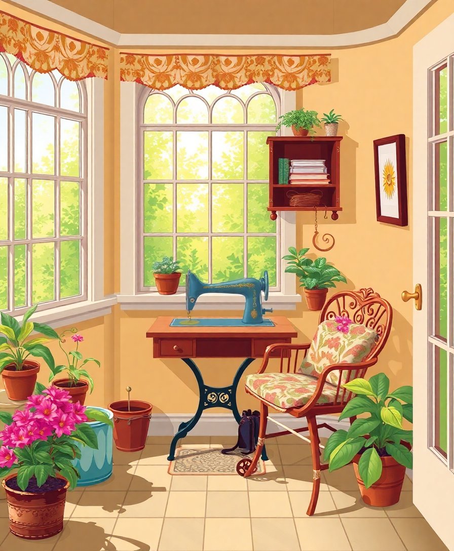 Transform your space with this enchanting Vintage Sunroom Sewing Box Paint By Numbers kit. This detailed masterpiece captures the nostalgic charm of a sunlit sewing room filled with vintage treasures and tropical warmth.