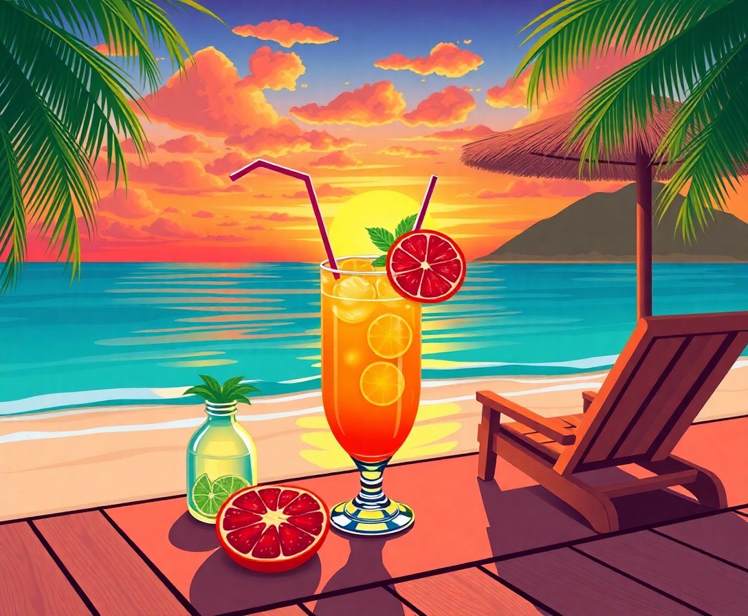 Experience the joy of creating your own tropical retreat. Consequently, this kit transforms any room into an island escape. Therefore, order your Vintage Sunset Mai Tai Paint By Numbers today.