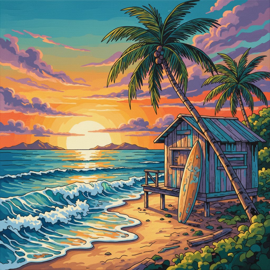 Transform your creative space with this captivating Vintage Surf Shack Sunset Paint By Numbers kit. Additionally, this nostalgic design captures the essence of classic beach culture. Furthermore, warm sunset hues blend seamlessly with vintage surfboard silhouettes.