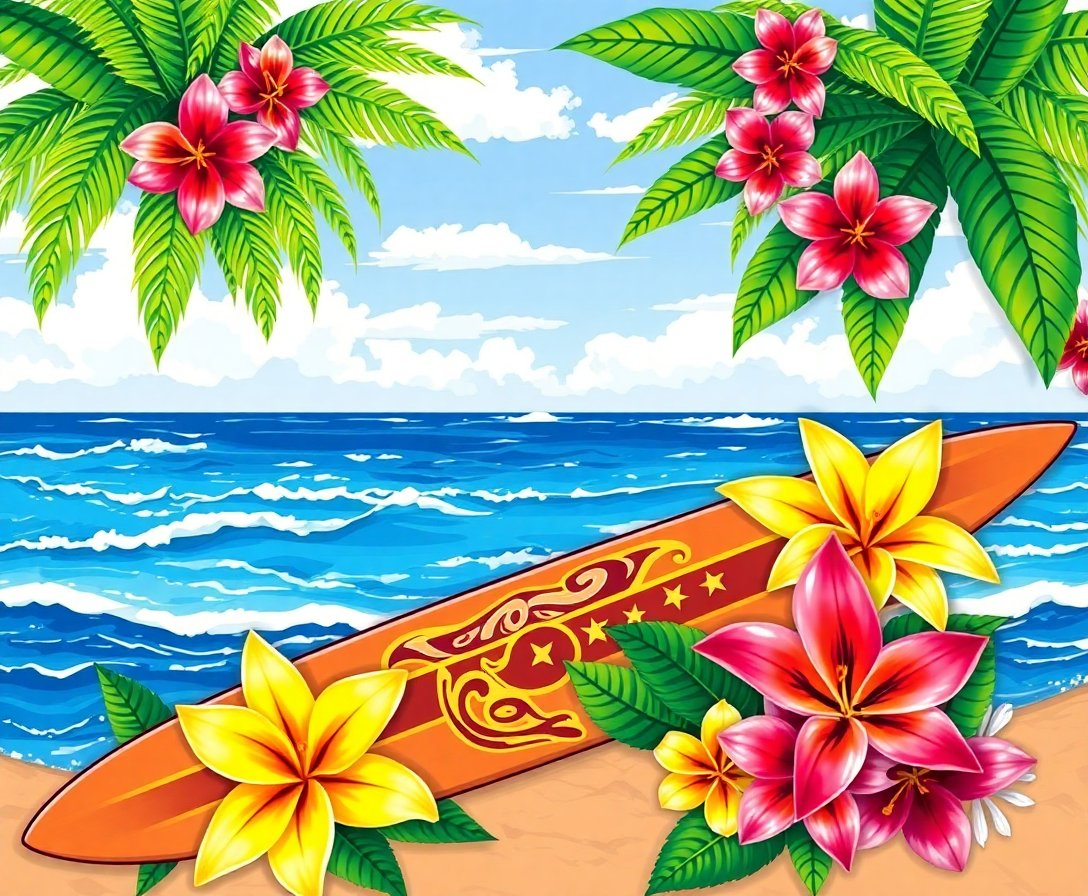 The combination of classic surfboard imagery with delicate lily leis creates a unique tropical aesthetic. The soft pastel colors perfectly capture vintage Hawaiian charm.
