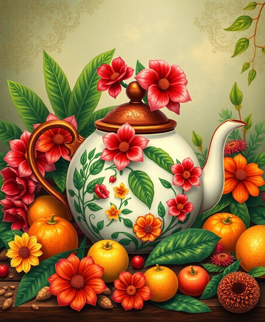 Ultimately, step back and admire your completed masterpiece. Additionally, the warm glow and tropical elements create a captivating focal point. Therefore, your vintage teapot scene brings timeless elegance to any room.