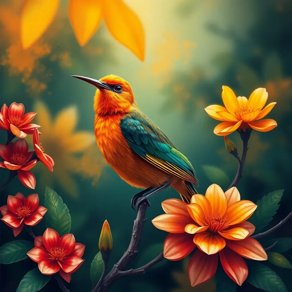 Ultimately, step back and admire your completed tropical masterpiece. The vibrant sunbird emerges dramatically against the torch ginger backdrop. Your finished artwork transforms any room into a celebration of tropical wildlife beauty.