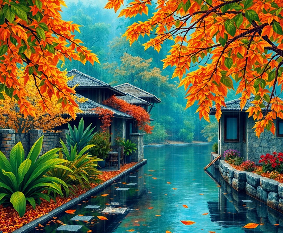The golden monsoon theme combines nostalgic charm with tropical beauty, creating a unique artistic experience that celebrates autumn rain in warm climates.