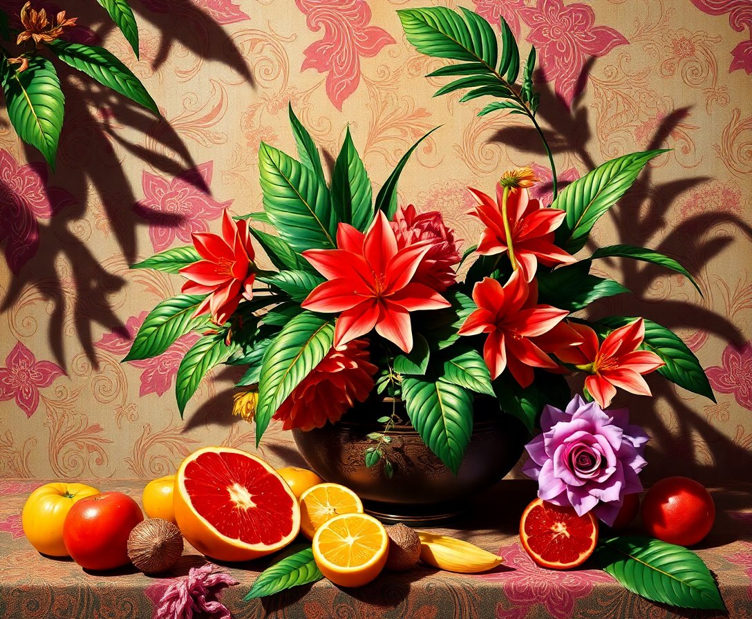 Ultimately, step back and admire your finished vintage masterpiece. Furthermore, the interplay between tropical elements and moody shadows creates stunning visual impact. Additionally, your completed artwork radiates sophisticated baroque elegance.