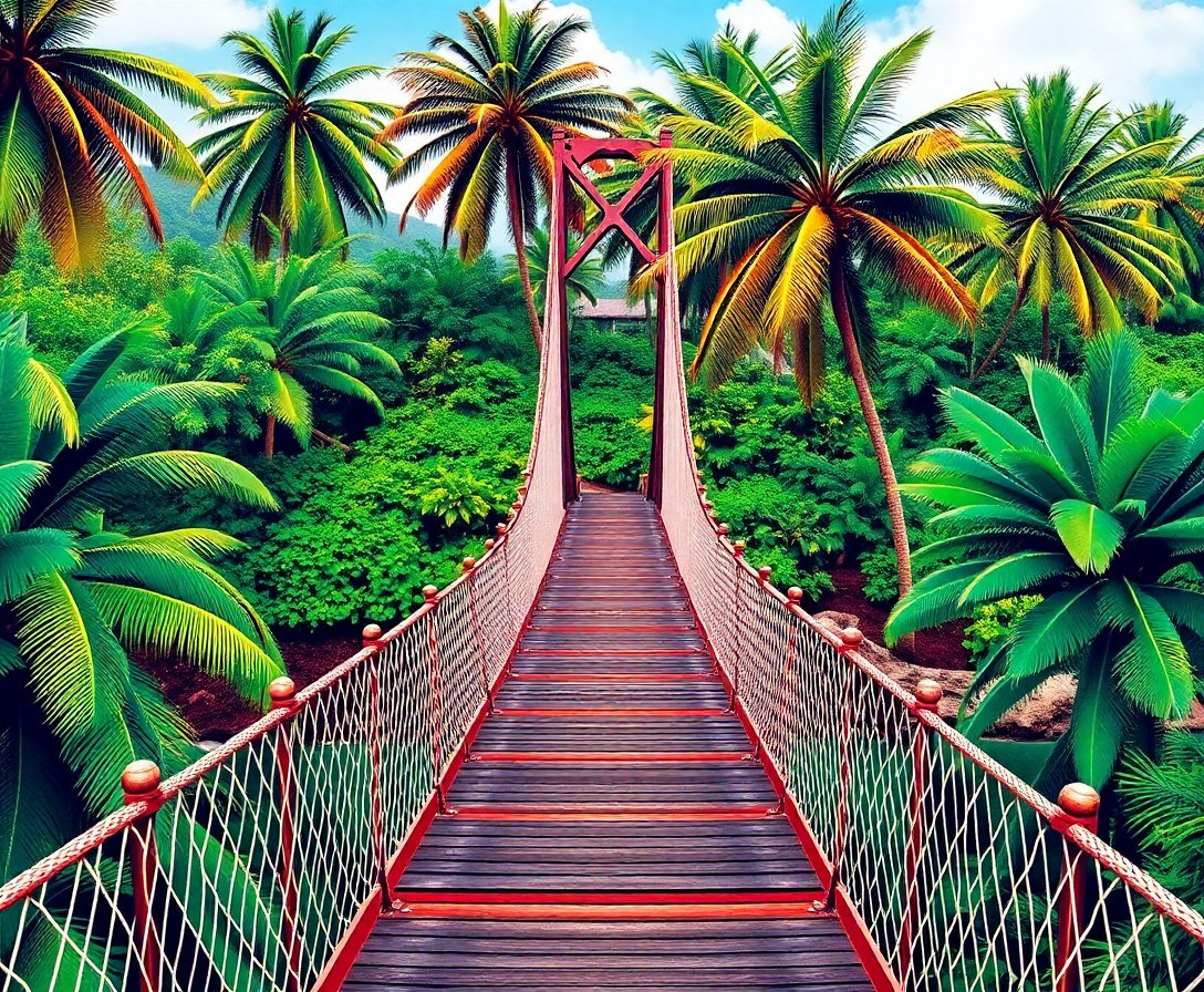 Start your artistic adventure today with this enchanting tropical bridge scene. Let each brushstroke transport you to a misty morning paradise where architecture meets natural beauty in perfect harmony.