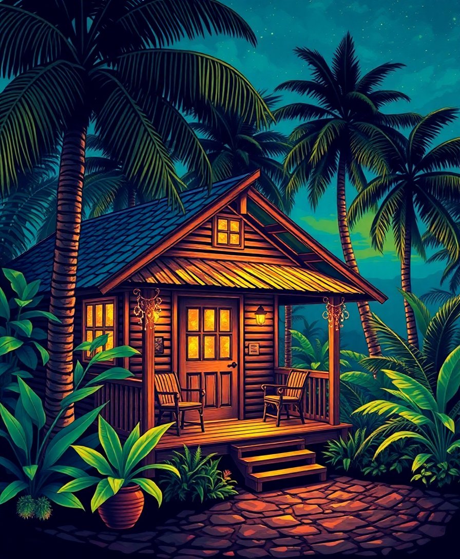 Ultimately, add final details with your small brush to complete the warm lighting effects. Therefore, your vintage tropical cabin scene will radiate with authentic rustic charm. Finally, step back and admire your completed masterpiece ready for display.