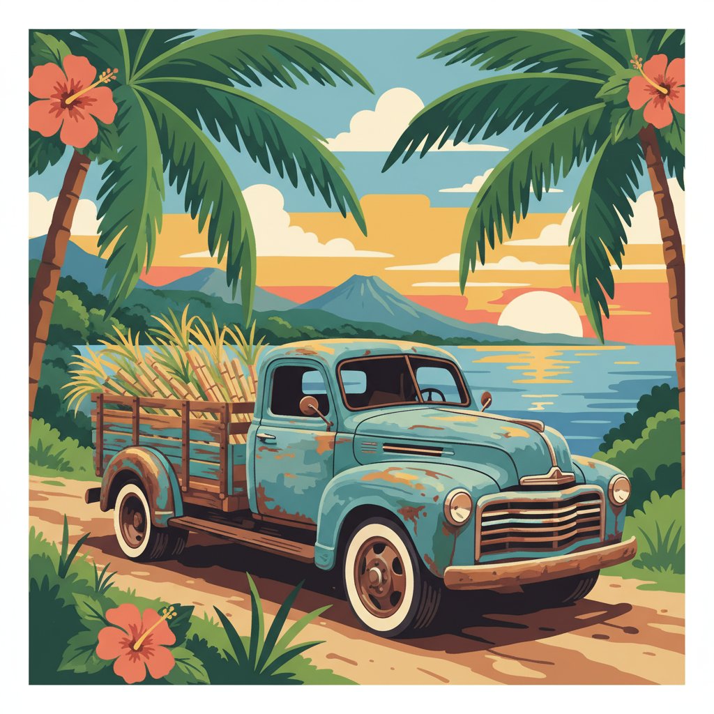 Transform your artistic journey with the Vintage Tropical Cane Truck Paint By Numbers, capturing the essence of nostalgic countryside charm. This captivating design features a weathered pickup truck adorned with tropical sugarcane, evoking memories of dusty heritage backroads and simpler times.