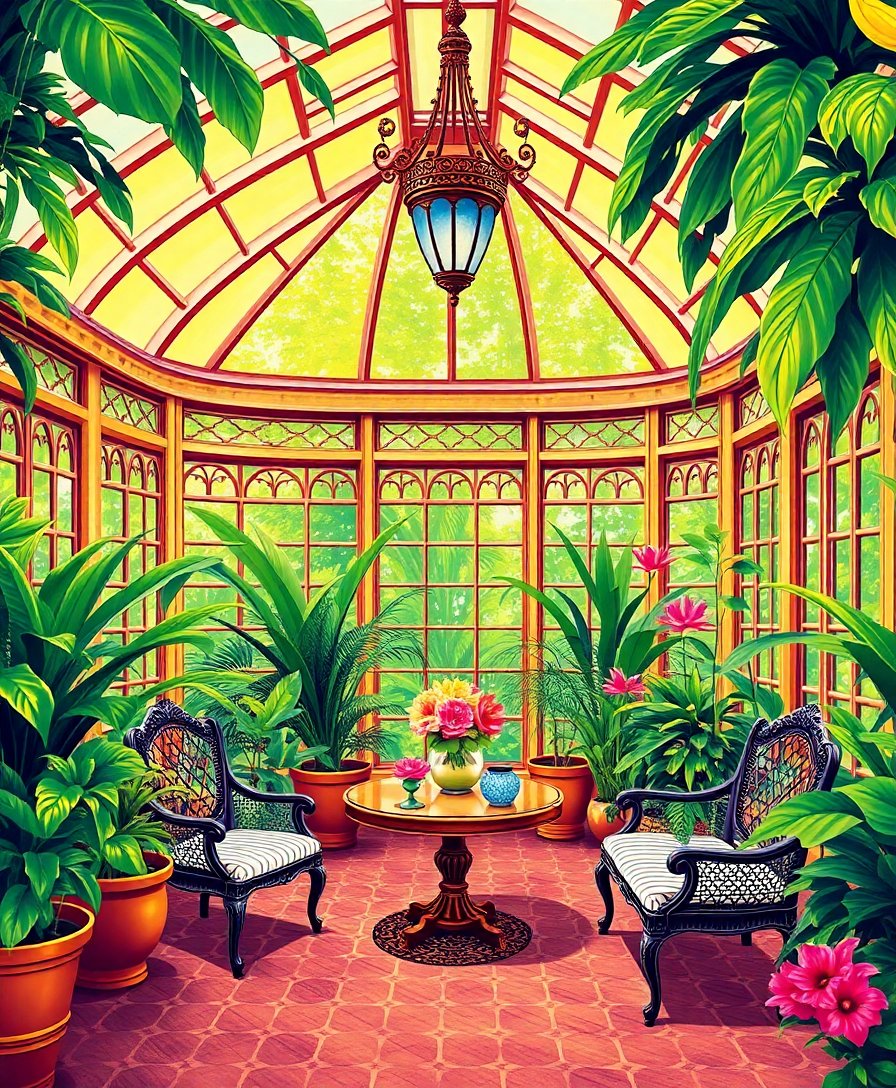 Ultimately, step back and admire your completed tropical conservatory scene. The cozy indoors atmosphere you’ve created brings warmth and botanical beauty to any room.