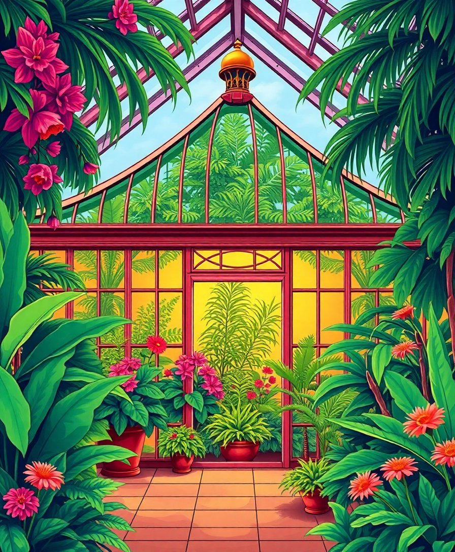 The high-quality linen canvas measures 16×20 inches, providing ample space to capture all the intricate glasshouse details and tropical elements beautifully.