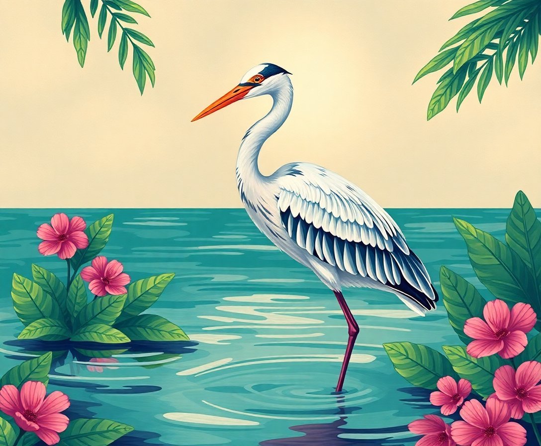 Ultimately, step back and admire your completed tropical heron masterpiece. The turquoise shallows and vintage details create a stunning focal point. Your artistic achievement deserves proud display in your favorite room.