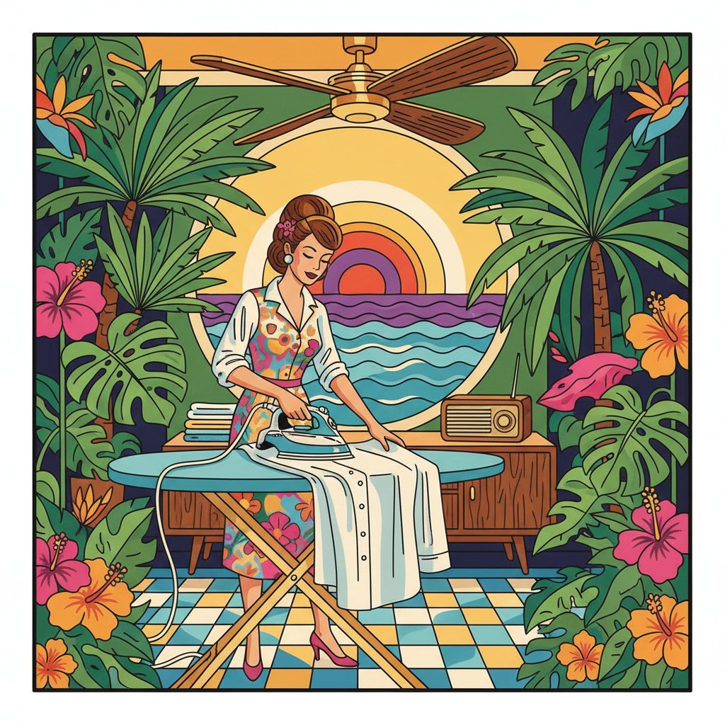 Premium linen canvas ensures lasting durability and professional results. Furthermore, high-quality acrylic paints deliver vibrant, fade-resistant colors. The nostalgic tropical ironing room theme creates a unique conversation piece for any cozy indoors space.