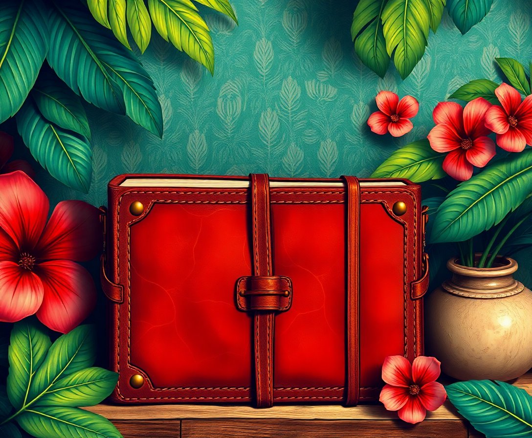 The sepia tones and tropical elements create a nostalgic atmosphere reminiscent of classical travel journals. The leather diary theme adds authentic vintage charm to your finished artwork.