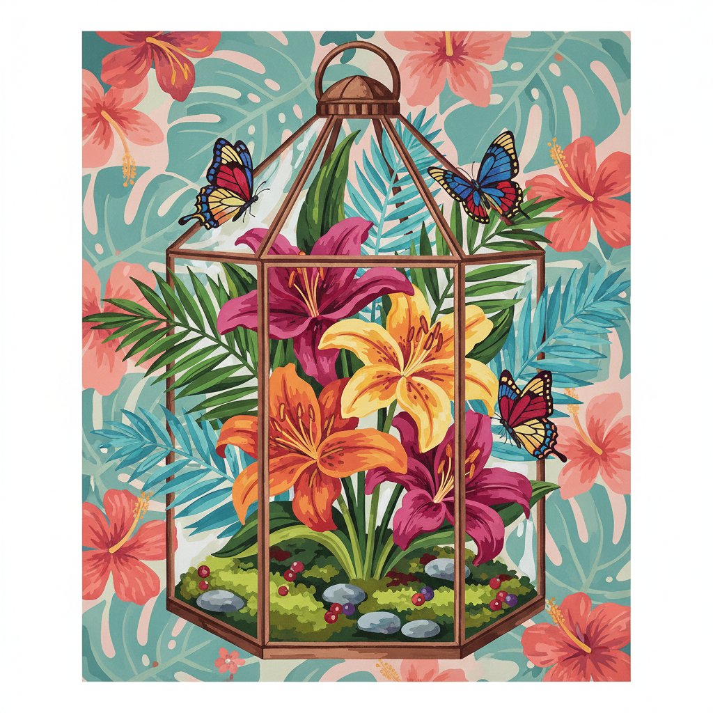 Ultimately, step back and admire your completed tropical masterpiece. The emerald lilies and vintage terrarium details create a stunning focal point. Moreover, your finished artwork radiates botanical beauty and artistic accomplishment.