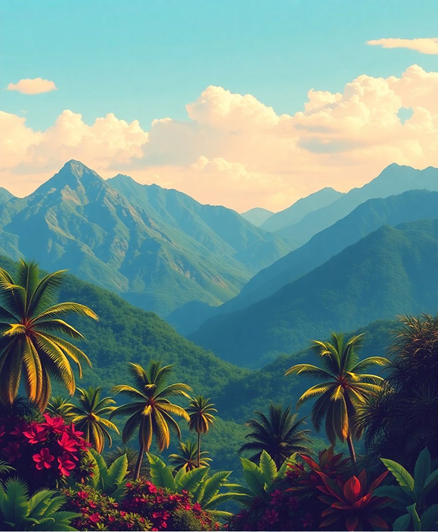 Ultimately, step back and admire your completed tropical mountain scene. The vintage aesthetic combined with tropical elements creates a conversation piece. Your finished painting captures both nostalgic charm and natural beauty.
