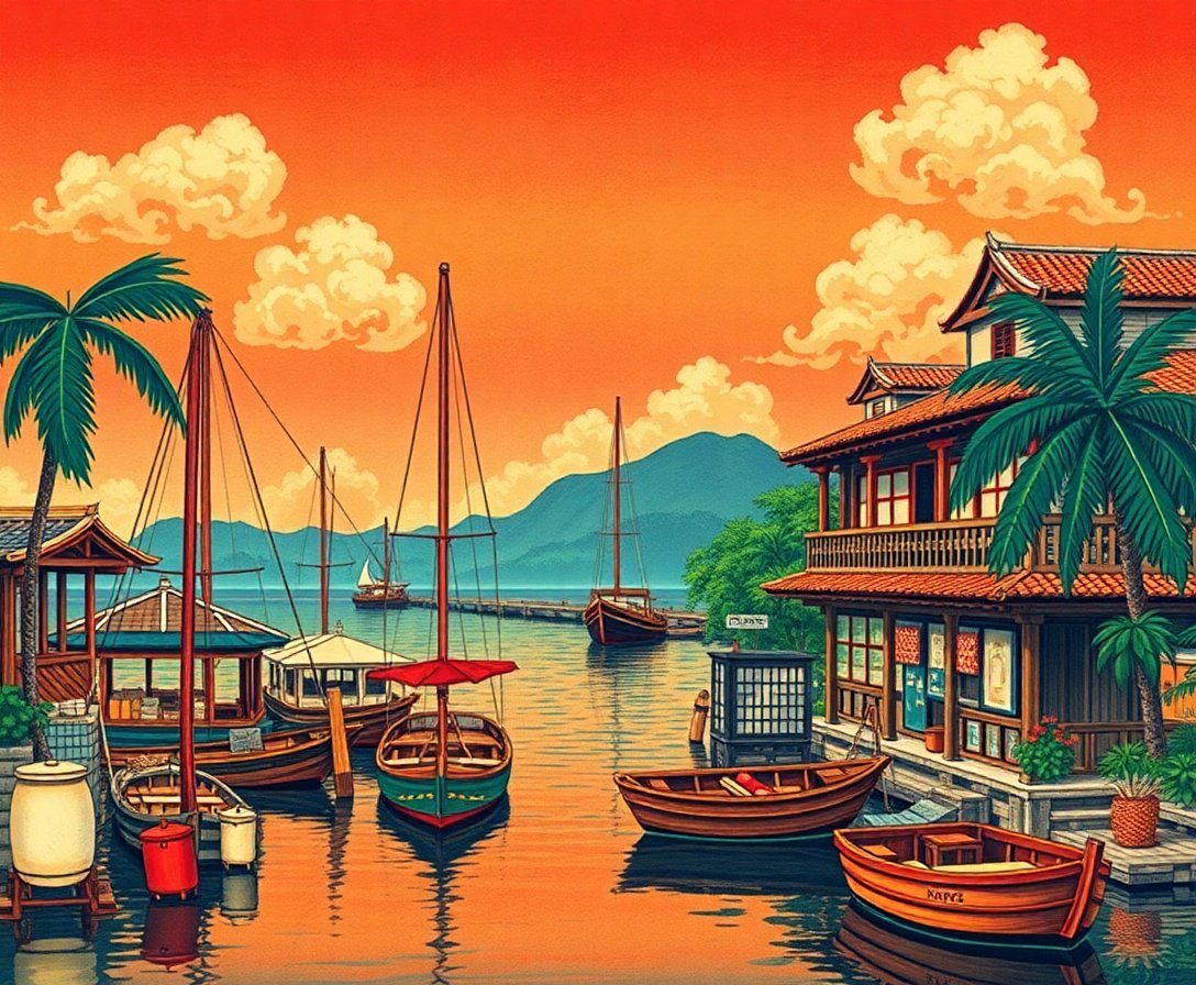 This vintage tropical harbor scene captures the essence of traditional Japanese maritime art. The turquoise waters and historic vessels create an authentic cultural experience.