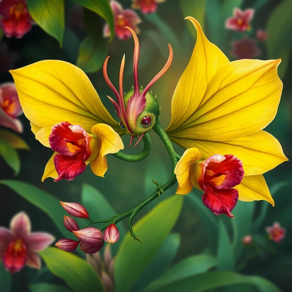 Ultimately, step back and admire your finished masterpiece. The tropical orchids dance alongside the mystical sprite. Your completed artwork radiates vintage charm and magical energy.