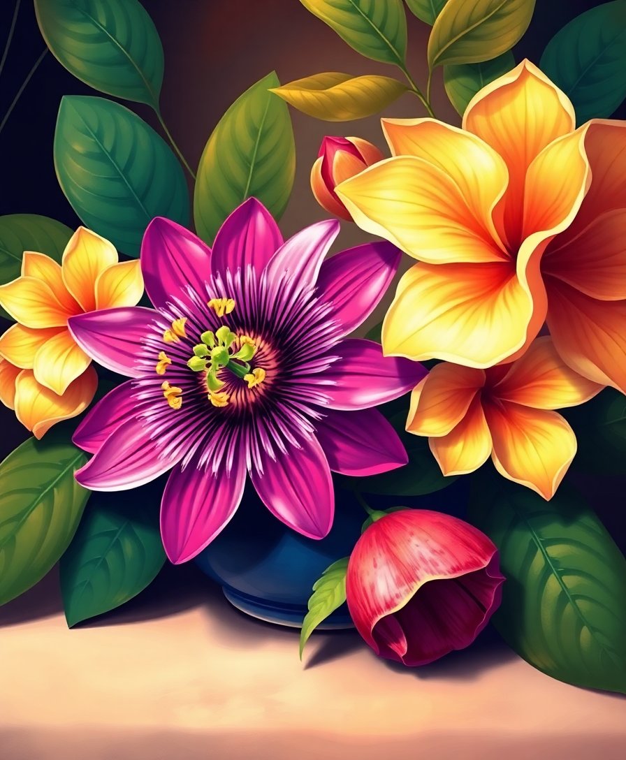 This vintage-inspired design stands apart from typical offerings. The passionflower motif combines classical elegance with tropical warmth. Additionally, golden sunbeam effects create stunning visual depth. Perfect for beginners and experienced painters seeking sophisticated classical floral still life subjects.