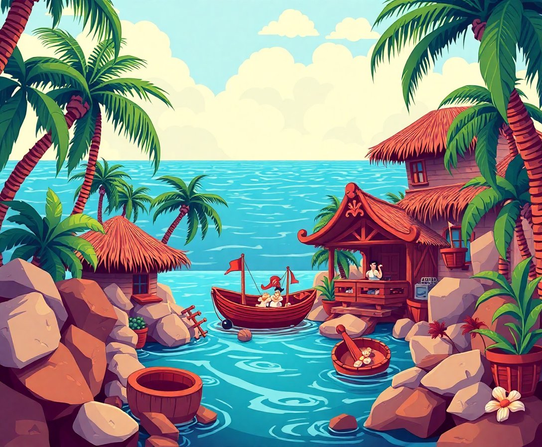 Ultimately, add final details with the small brush for crisp lines and highlights. Step back and admire your completed tropical paradise. Your pirate cove now radiates with authentic 1930s charm and nostalgic appeal.