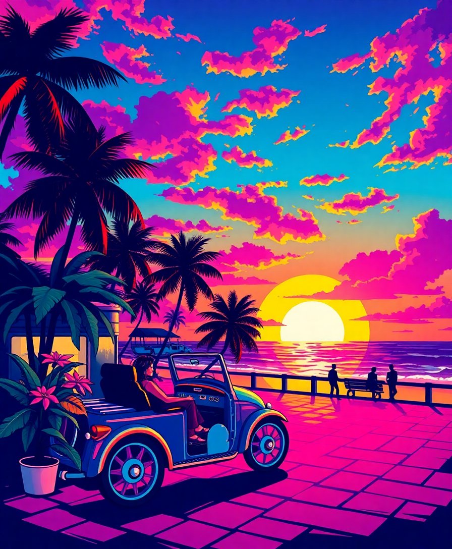 Furthermore, our premium materials ensure vibrant, long-lasting colors. The detailed design captures authentic 70s roller disco atmosphere. Each brush stroke brings the tropical sunset scene to life. The combination of disco culture and tropical aesthetics creates unique wall art. Perfect for gifting or personal enjoyment.