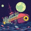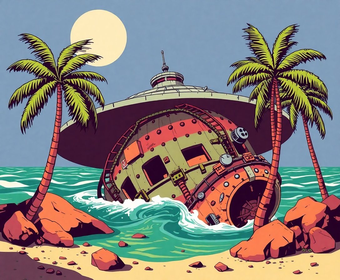 This unique blend of vintage UFO themes with tropical coral reef elements creates striking wall art. The retrofuturism style appeals to sci-fi enthusiasts and ocean lovers alike.