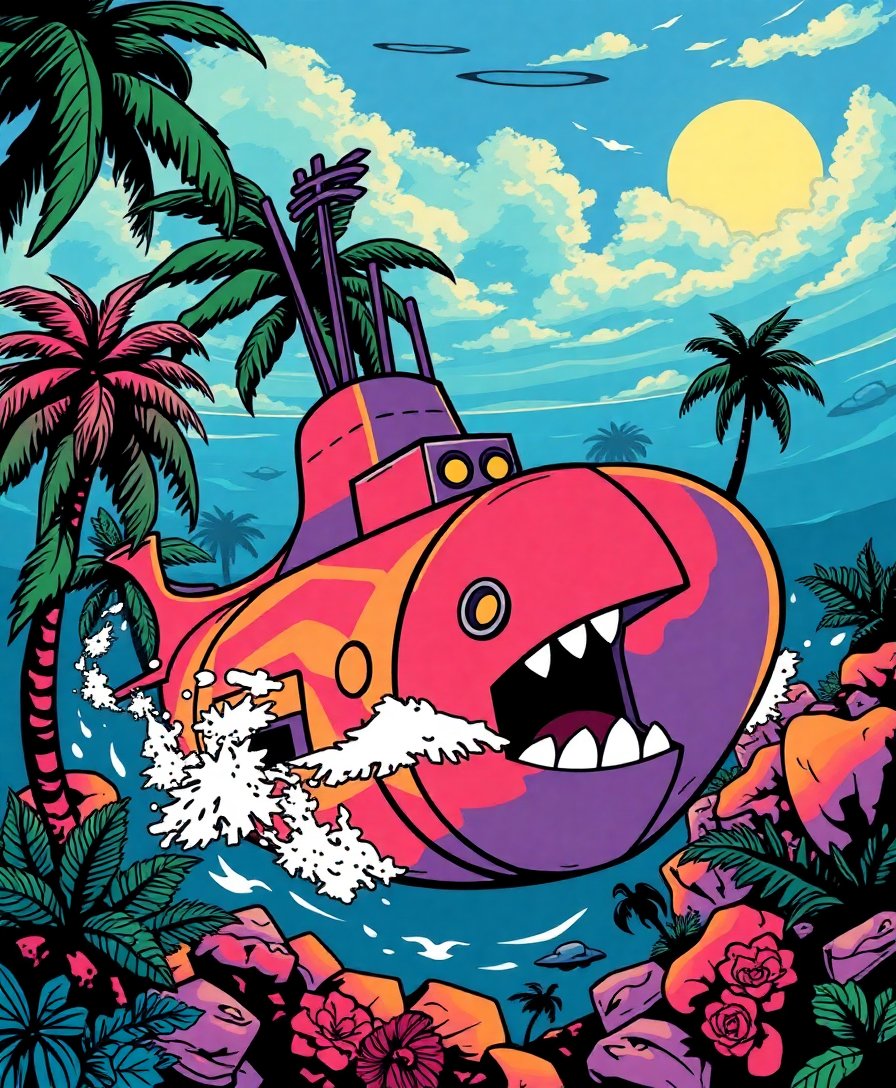 Ultimately, step back and admire your completed underwater adventure scene. The tropical elements and submarine details create a stunning vintage aesthetic. Your finished artwork captures the essence of classic pulp fiction storytelling.