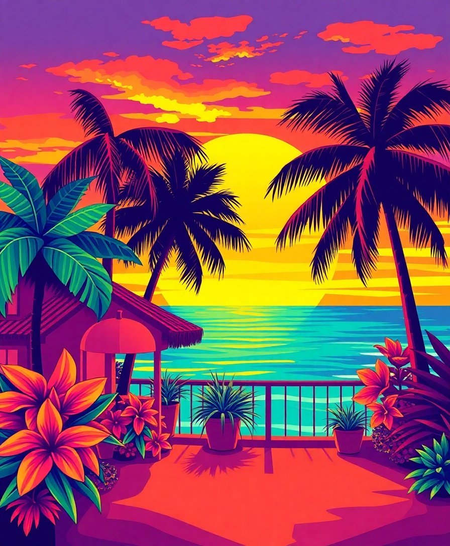Create your own tropical paradise while enjoying hours of relaxing creativity. This Vintage Tropical Sunset Shades Paint By Numbers transforms any space into an artistic haven.