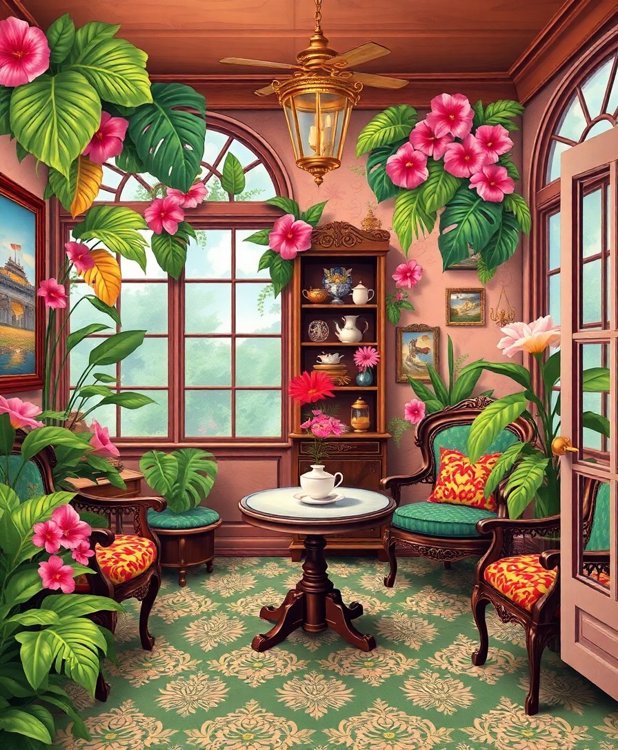 Ultimately, step back and admire your completed Victorian tea room scene. Moreover, the nostalgic atmosphere you’ve created brings warmth to any space. Your tropical parlor masterpiece now radiates timeless elegance.